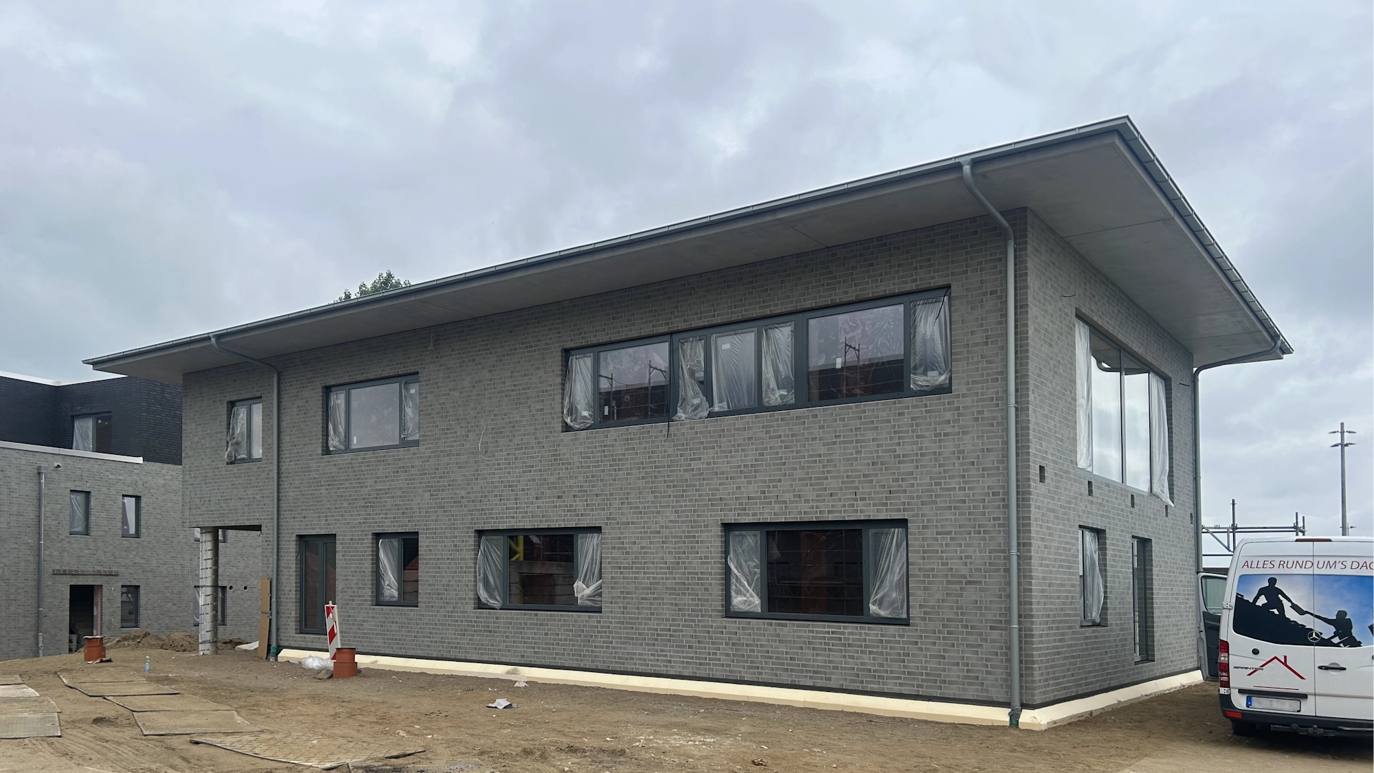 - Unterkellerung im Hang für Haustechnik, Verbindung vom 2.OG Bestand zum UG Neubau, massive Bauweise in Stahlbeton mit Verblendsteinfassade.